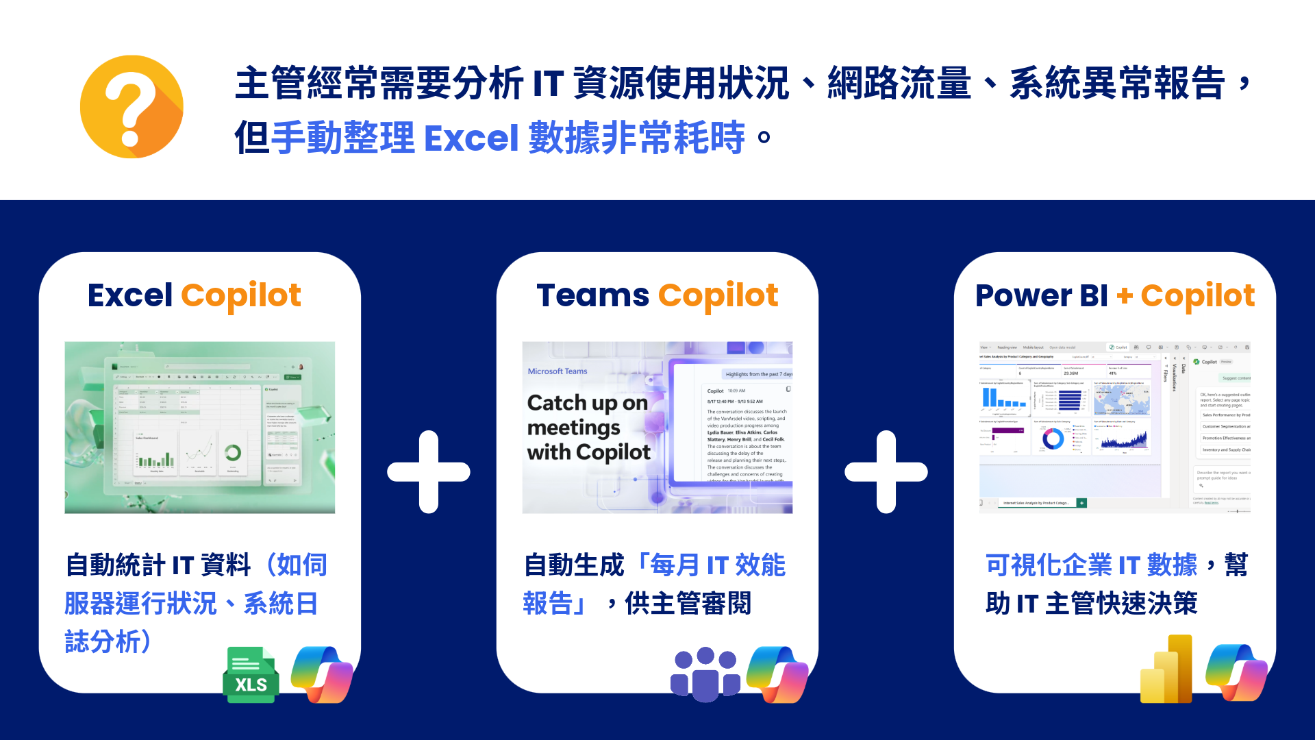 - 解決方案:Copilot 透過 Excel、Teams、Power BI,能快速分析與視覺化 IT 數據,減少人工作業時間。