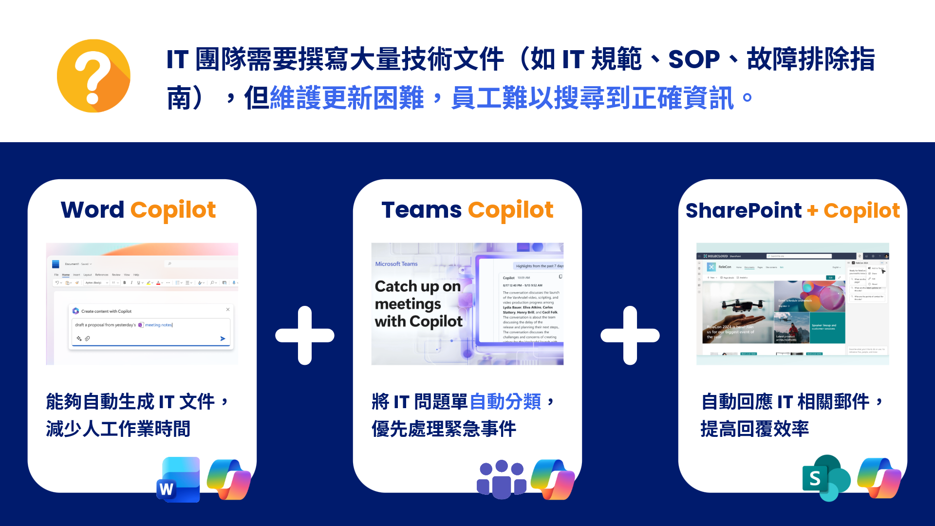 - 解決方案:Copilot 能自動生成、更新 IT 文件,並與 SharePoint、Teams 整合,確保知識庫維持最新狀態。