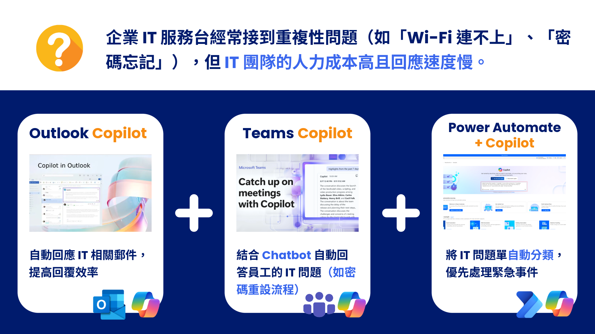 - 解決方案:Copilot 整合 Teams Chatbot、Outlook、Power Automate 自動回應,提高技術支援效率。